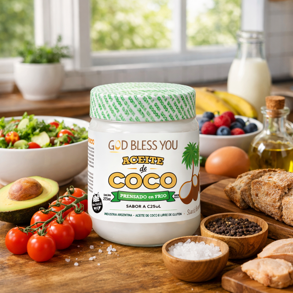 Proveniente de plantaciones de cocos frescos recién recolectados y prensados en frío, se exprime la pulpa blanca carnosa de este fruto, logrando un aceite de aroma y gusto intenso y delicioso de excelente calidad conservando el 100% de sus propiedades. Rico en ácido láurico y ácidos grasos de cadena media que son fuente de pura energía. Ideal en licuados – mate – café – sopas – comidas crudas y cocidas, soporta altas temperaturas en la cocción sin oxidarse. El aceite de coco God Bless You se extrae de la Palmera Cocotera (cocos nucifera), no modificadas genéticamente y cultivadas bajo las buenas prácticas de la agro manufactura.