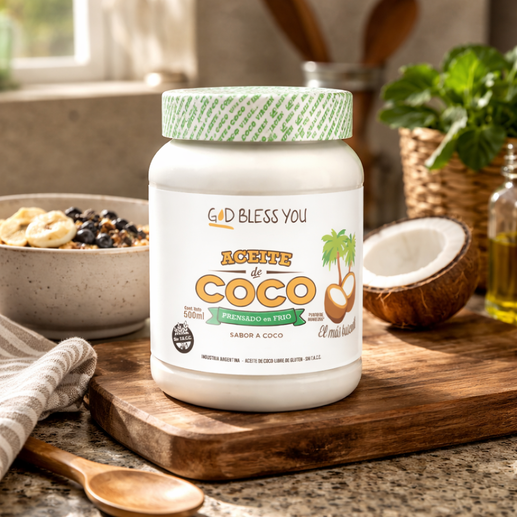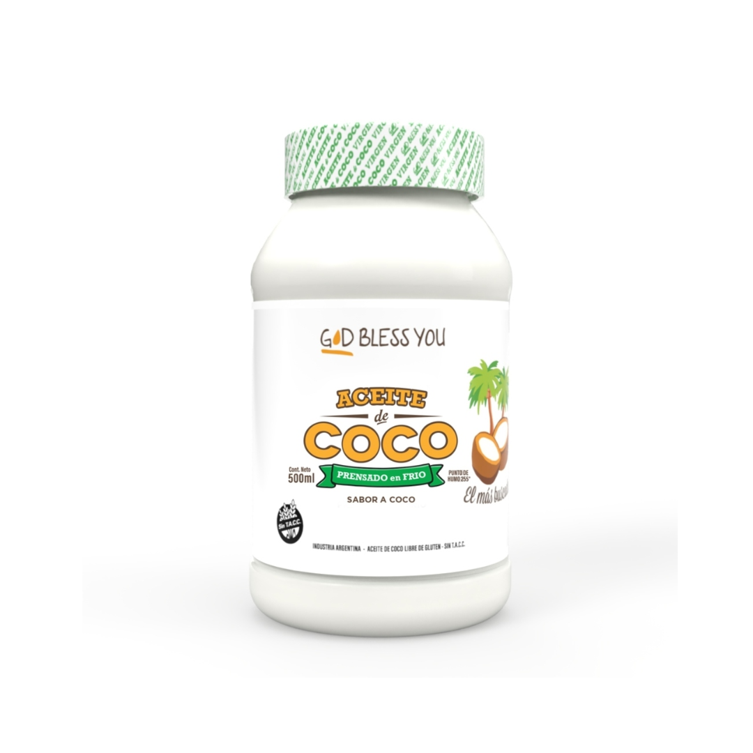 Proveniente de plantaciones de cocos frescos recién recolectados y prensados en frío, se exprime la pulpa blanca carnosa de este fruto, logrando un aceite de aroma y gusto intenso y delicioso de excelente calidad conservando el 100% de sus propiedades. Rico en ácido láurico y ácidos grasos de cadena media que son fuente de pura energía. Ideal en licuados – mate – café – sopas – comidas crudas y cocidas, soporta altas temperaturas en la cocción sin oxidarse. El aceite de coco God Bless You se extrae de la Palmera Cocotera (cocos nucifera), no modificadas genéticamente y cultivadas bajo las buenas prácticas de la agro manufactura.